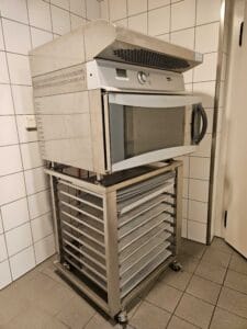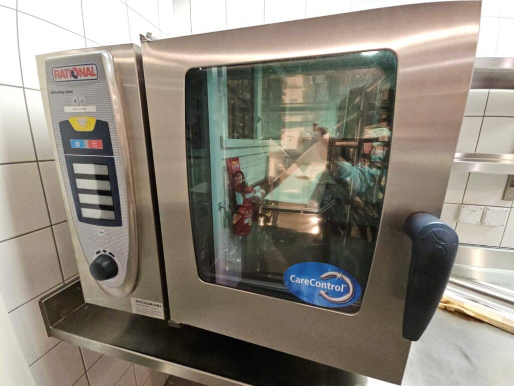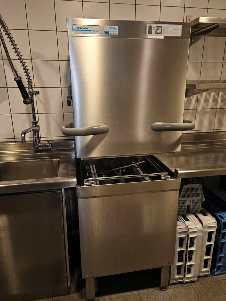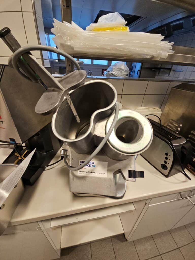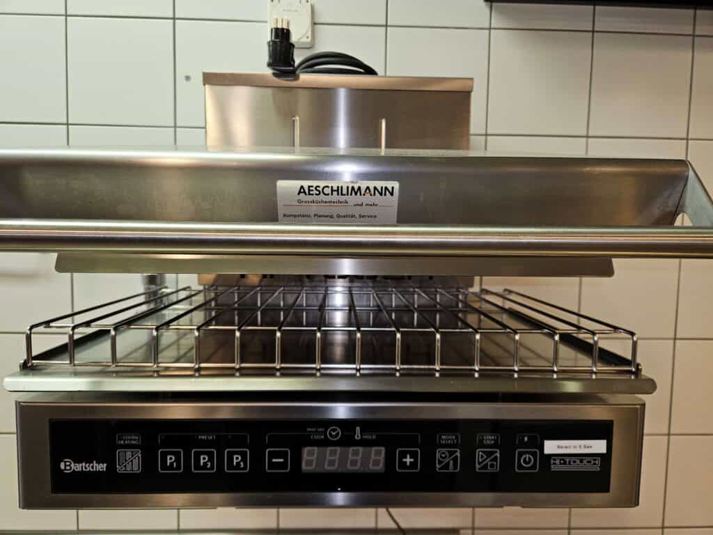 Kochherd, Kombidämpfer, Salamander, Griddleplatte Aeschlimann, Universalmaschine, Gemüseschneider, Rahmmaschine, Einbau-Glacestation, Eiswürfelmaschine, Kühl-Tiefkühlzelle, Chromstahlmöbel, Durchlaufgeschirrspüler, Hängeregale, diverse Küchengeräte.